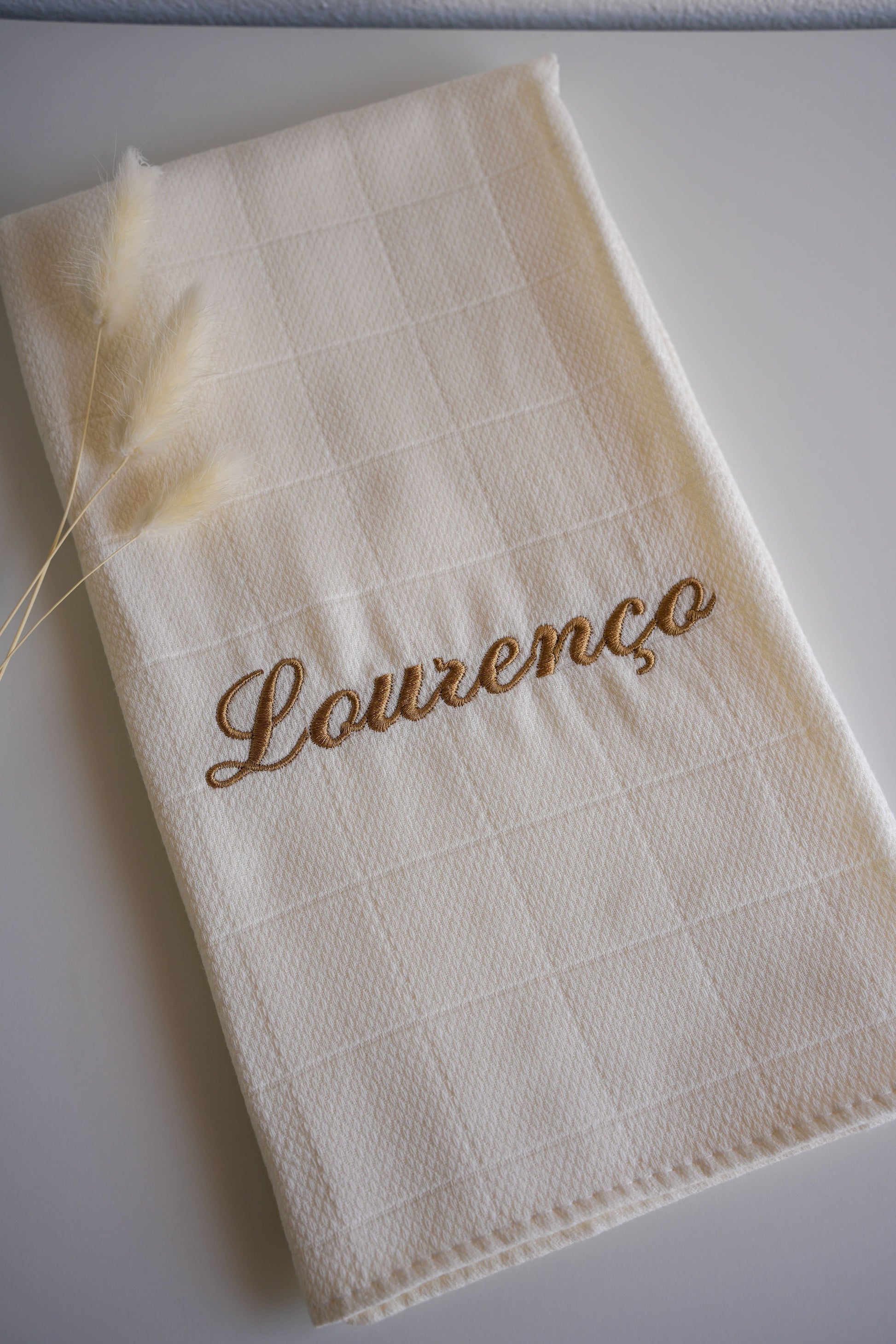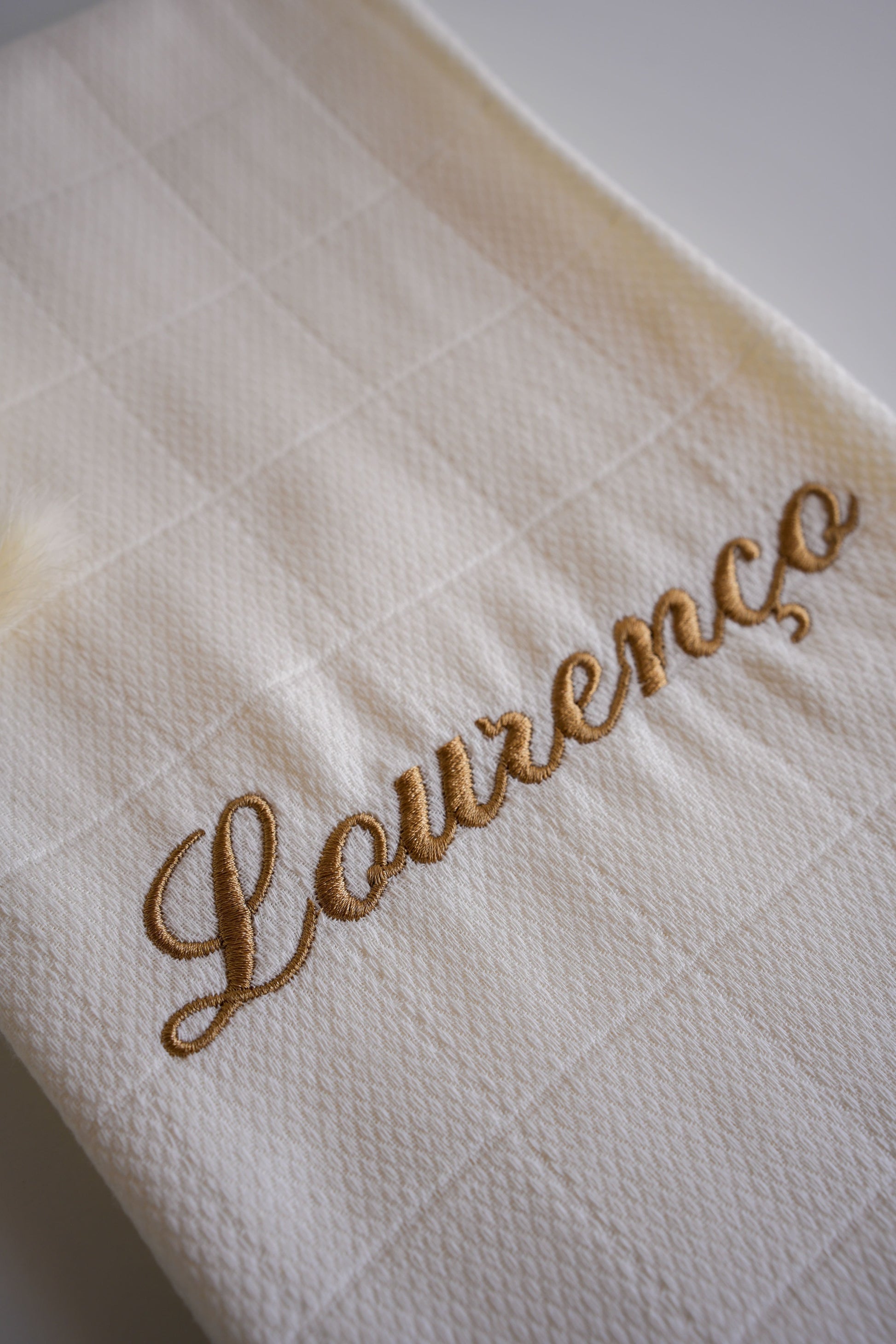 The Cotton Diaper with Embroidered Name is a delicate, practical and absolutely unique piece — created to accompany your baby at all times with a special touch.