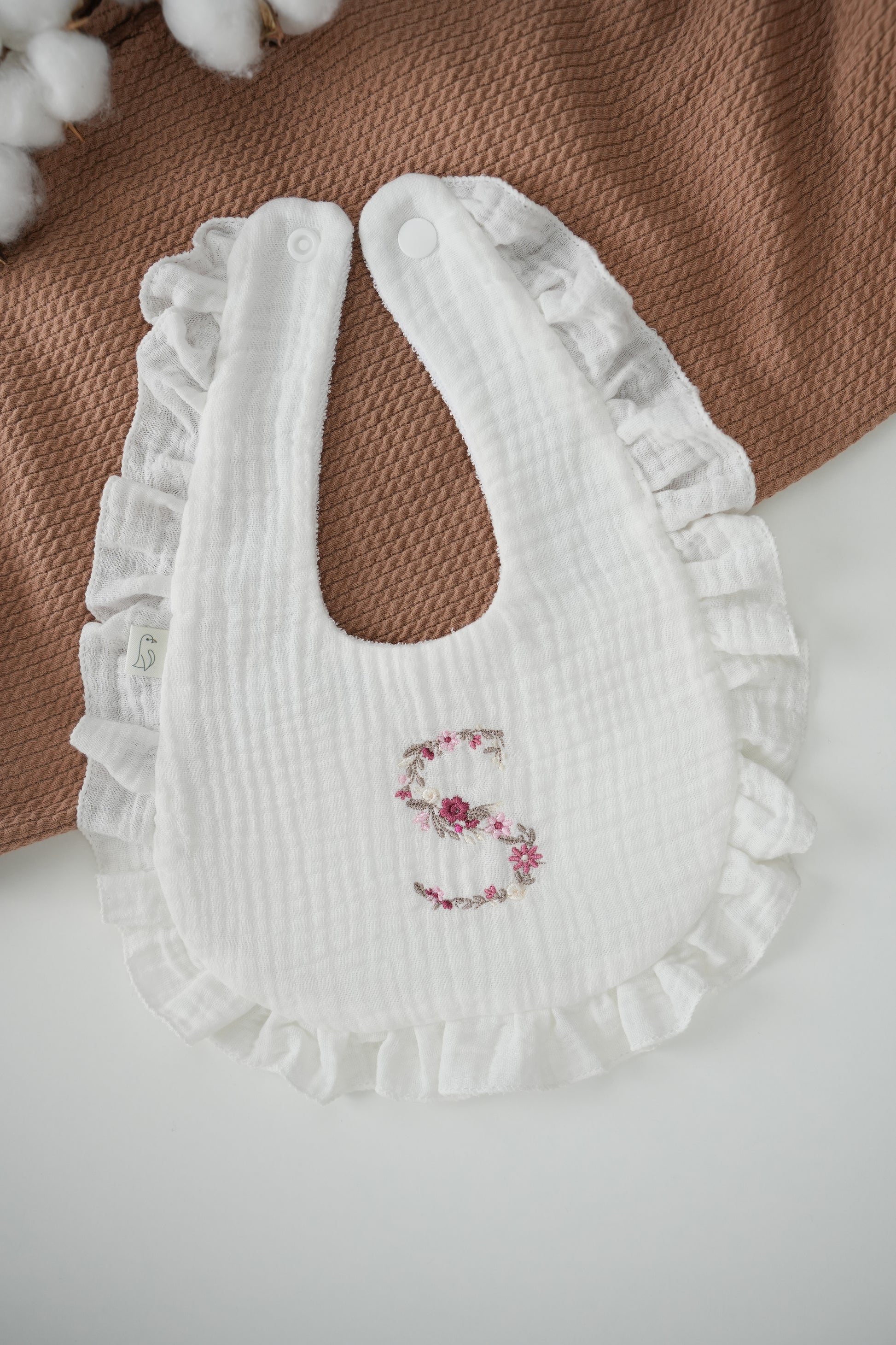 Sim! A inicial do nome do teu bebé será bordada neste estilo floral e super elegante — uma excelente opção para oferecer ou criar um conjunto personalizado.