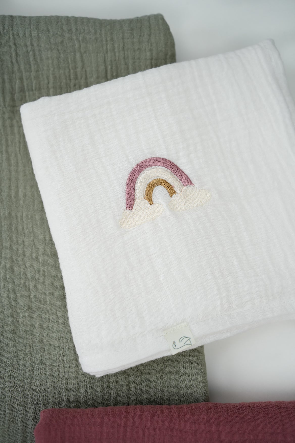 A nossa fralda de musselina com arco-íris bordado é um essencial para o dia a dia do bebé — versátil, respirável e incrivelmente suave ao toque.