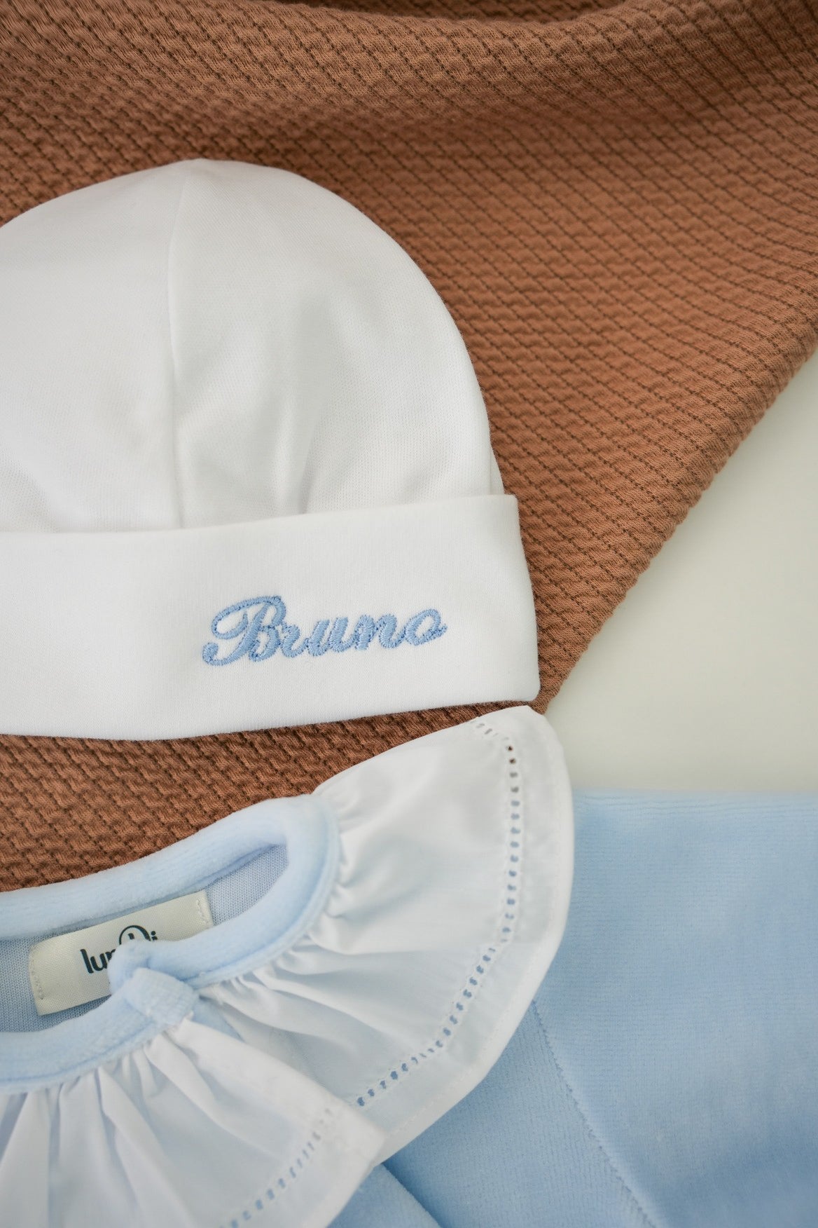 A personalização com nome bordado transforma este simples acessório numa peça especial, única e cheia de significado.